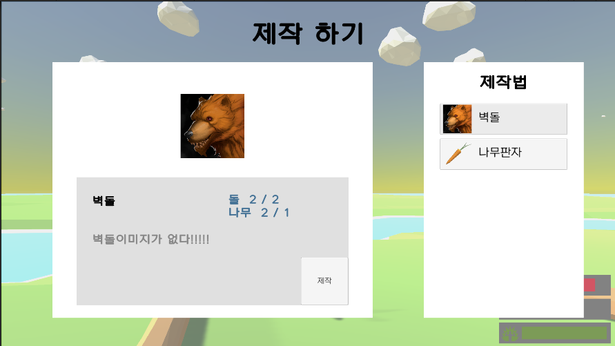 아무튼 이제 옆에 제작법을 선택하면 이름, 제작할 때 필요한 자원의 개수와 현재 보유한 수 그리고 아이템 설명이 뜬다.